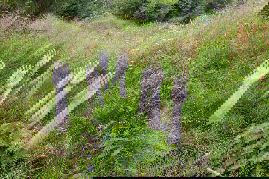 V Sudetech zaniklo mnoho obcí, u velké části z nich už ani nepoznáte, že tu kdysi žili lidé. V Königsmühle je to jiné. Díky ruinám domů si dokážete poměrně dobře představit, jak obec dříve vypadala. Mezi zbytky budov najdete celou řadu uměleckých děl, které tu každoročně vznikají díky land art setkáním řezbářů, stonebalancerů a dalších umělců.