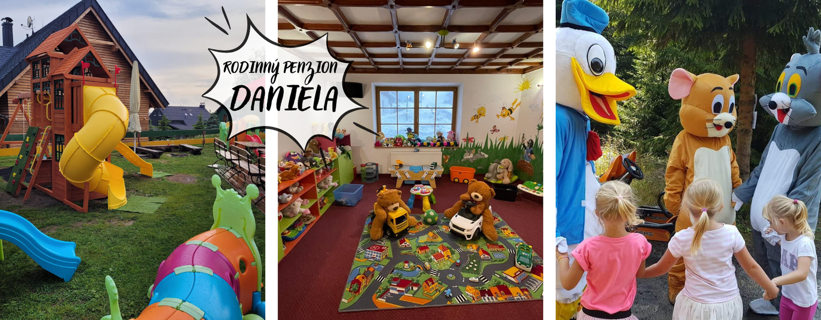 Penzion Daniela je perfektně uzpůsoben vám a vašim dětem. Kromě heren a venkovního hřiště jistě oceníte nočníky i redukce na záchod připravené na pokoji nebo možnost ohřát příkrm či sterilizovat lahvičky ve spodním patře, kde je malá kuchyňka právě pro tyto účely.