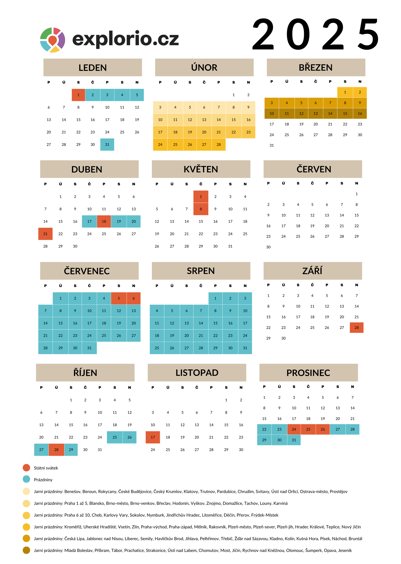 A abyste přehledně viděli celý rok, na co se máte těšit, připravili jsme pro vás kalendář státních svátků a prázdnin v roce 2025 – stáhnete ho níže.