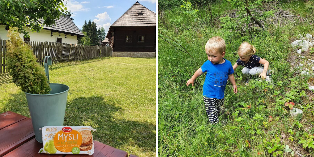 Na konečnou vláčku jsme dorazili asi po deseti minutách a zpátky jsme se vraceli pěšky příjemnou procházkou vhodnou i pro kočárek. Děti si ještě užili prolézání zaparkovaných historických mašinek, trhání lesních jahod a po návratu do vesničky druhou vlnu svačinky v podobě Emco sušenek.