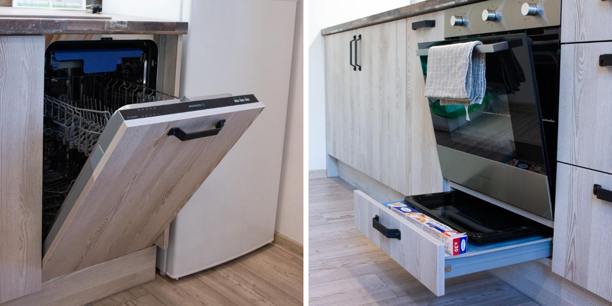 Kuchyň byla taky perfektně vybavená, nechybělo nic. Nekazte si dovolenou umýváním nádobí, každý apartmán má myčku. A pokud si budete chtít upéct třeba borůvkový koláč, protože borůvek bylo všude v lese plno, není problém. Apartmány jsou vybavené troubou a najdete tu dokonce i papír na pečení.