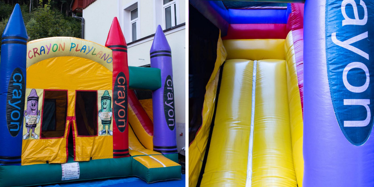 Ale vlastně po celém domě chodily děti samy, i ty hodně malé. Vše je tu pro děti přizpůsobené a když se nějaký prcek zatoulal, vždy ho někdo dovedl do správného apartmánu. V přízemí můžou děti řádit v tělocvičně a venku čeká největší atrakce - obří skákací hrad.