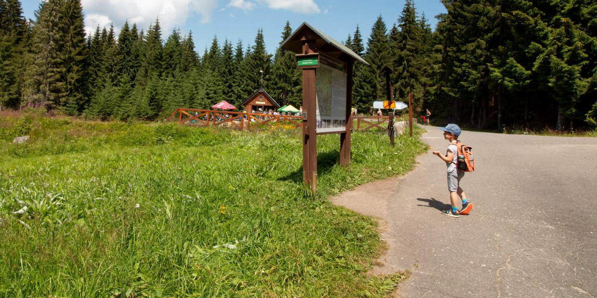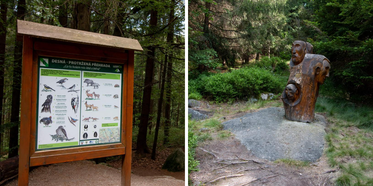 Na výlet jsme se vydali také k Protržené přehradě na Bílé Desné, z apartmánů to je něco málo přes 4 kilometry jedním směrem a cestu lemuje naučná stezka a dřevěné sochy.