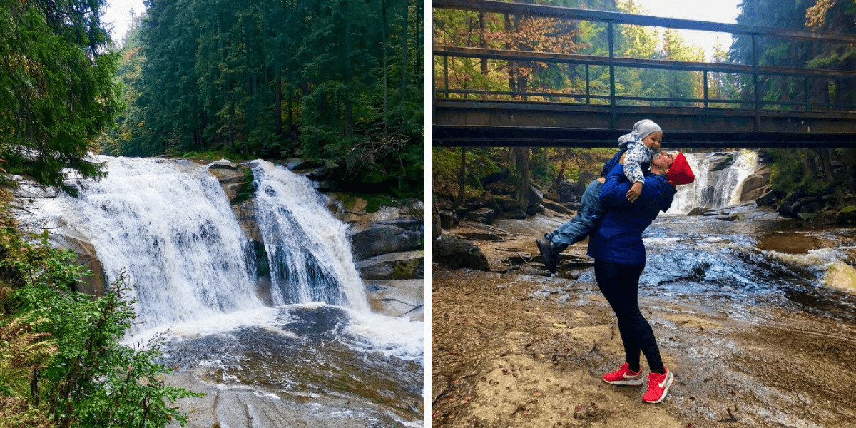 Další den se počasí umoudřilo a my vyrazili na výlet. Velkou výhodou hotelu OREA Resort Sklář je jeho poloha, všude jsme to měli kousek. A protože těch cílů jsme ten den měli více, vyrazili jsme autem, které jsme zaparkovali na centrálním parkovišti v Harrachově za 100 Kč na celý den. Nejprve jsme namířili k Mumlavským vodopádům. Od parkoviště k vodopádu vede stezka dlouhá necelý kilometr. Deset metrů vysoký vodopád byl obklopený krásnou kulisou podzimně zbarvených stromů. Jedním slovem – nádhera.
