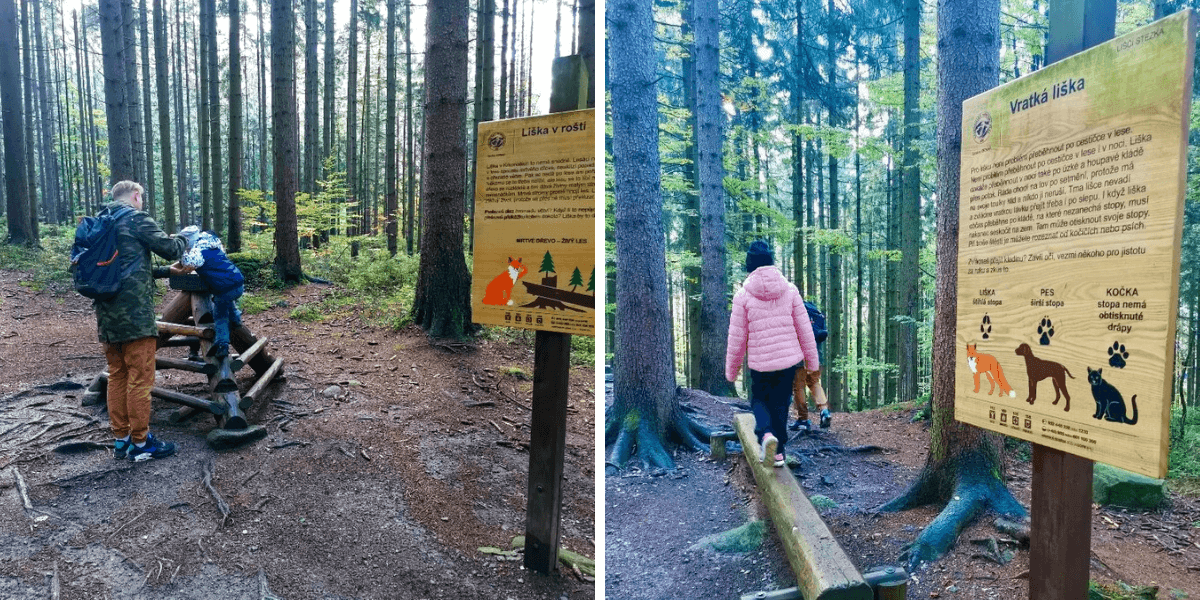 Přešli jsme most a vydali se po asfaltové cestě směrem k Liščí stezce, která je od vodopádu vzdálená přibližně 500 metrů. Cestou je velké množství kešek, tak pokud vás baví kešky objevovat, tady si přijdete na své. A pokud vás přepadne hlad nebo chuť na něco dobrého, Srub U lišáka, který je jen pár kroků od vodopádů, vám přijde vhod. Na naučné Liščí stezce se dozvíte plno zajímavostí ze života lišek. Víte třeba, jak taková liška dokáže ulovit ježka, i když je samá bodlina? Děti rozhodně zaujme možnost překonat několik překážek jako je průlez liščí norou, chůze po vratké kládě nebo lezení přes roští.