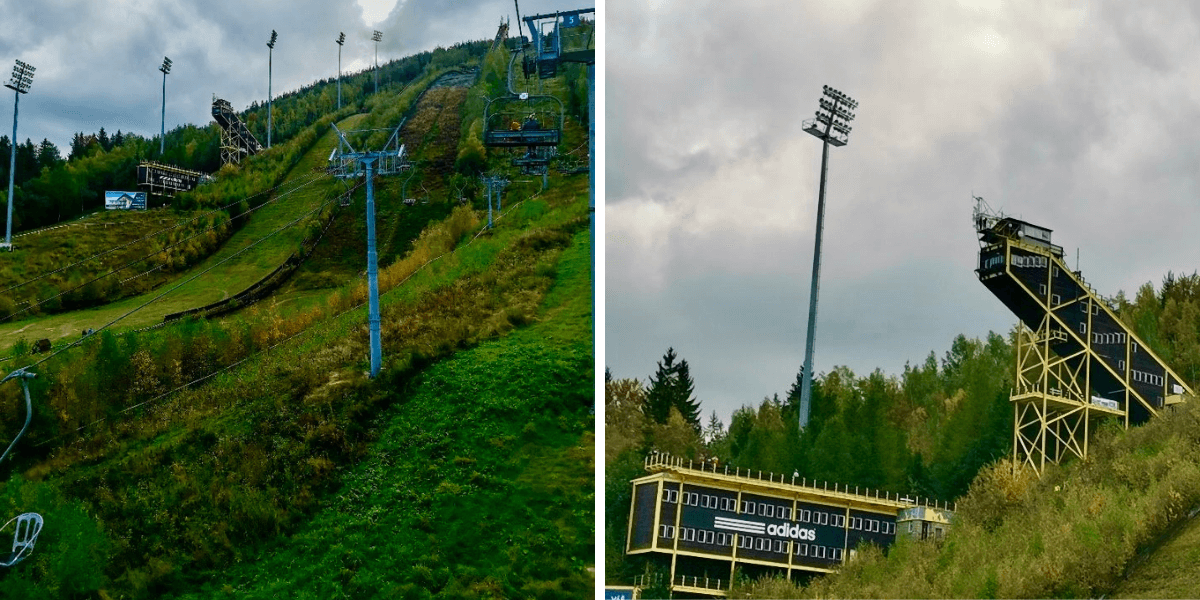 Na odpoledne jsme si připravili trochu adrenalinu v podobě výpravy na Čertovu horu, která se tyčí nad Harrachovem. Nahoru jsme jeli lanovkou, která jezdí momentálně vždy v půl a celou. Už jen ta jízda je pořádné dobrodružství. Jedete totiž okolo dominanty Harrachova – okolo Mamutího můstku, který se řadí mezi šest největších na světě. Leze mi mráz po zádech jen při představě, že bych z tak vysokého můstku měla sjet. To by pro mě opravdu nebylo.