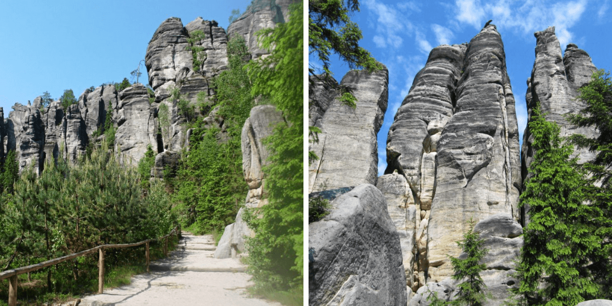 Trasy v Teplických skalách prověří vaši fyzičku víc než blízké Adršpašské skály. Prohlídkový okruh vede po modré značce a je dlouhý asi 6 km, užijete si vysoké skály, tajemné jeskyně i úzké průrvy. I tady mají skály svá jména, uvidíte tu Ledního medvěd, Golema, Řeznickou sekyru, Krakonošovo párátko i Psa Filipsa. Narazíte tu také na místo nazývané Česká Sibiř, kde můžete objevit zbytky sněhu i v letních měsících. A u zříceniny hradu Střmen si zahrajte na rytíře.