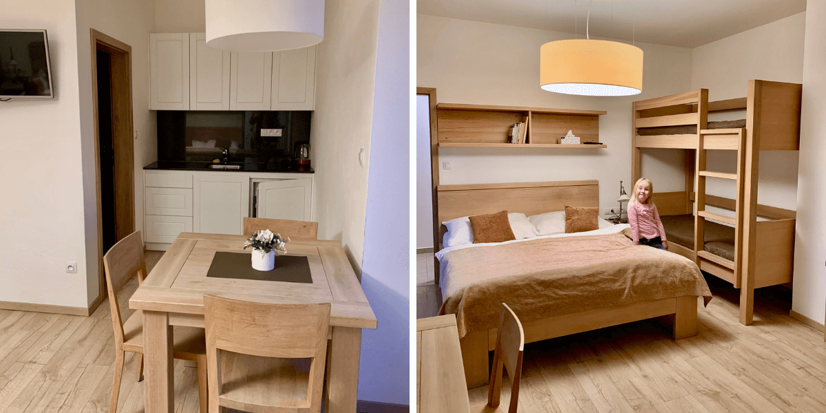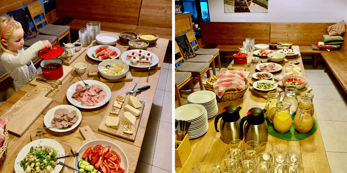 Snídaně není zahrnuta v ceně apartmánů (u pokojů ano), je možné si ji připlatit, což určitě doporučujeme, protože snídaně jsou opravdu výborné a převážně z produktů místní Ekofarmy Svinná.