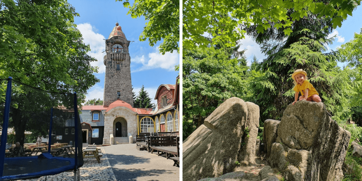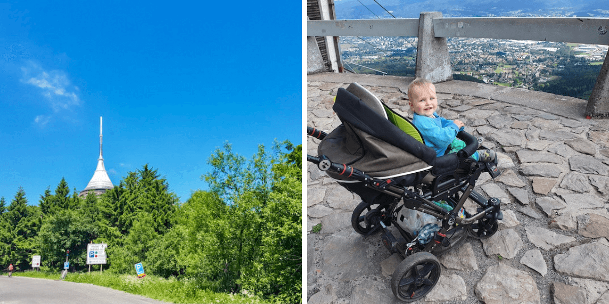 Až na vrchol Ještědu vede pohodlná asfaltová cesta, která se dá s kočárkem krásně zvládnout (jen pozor, občas tu jezdí auta). Parkování je možné na vícero parkovištích, čím výše, tím dražší parkovné, ale zase kratší cesta k vrcholu. Za mě je ideální zaparkovat v Horním Hanychově – Na Výpřeži a pokračovat asi 3 km až k rozhledně. Občerstvit se můžete v restauraci hotelu Ještěd nebo v sezóně využít venkovního kiosku. V restauraci jsou k dispozici dětské židličky, omalovánky pro děti a přebalovací pult. Zpět se musíte vrátit stejnou cestou, nebo lze využít kabinovou lanovku.