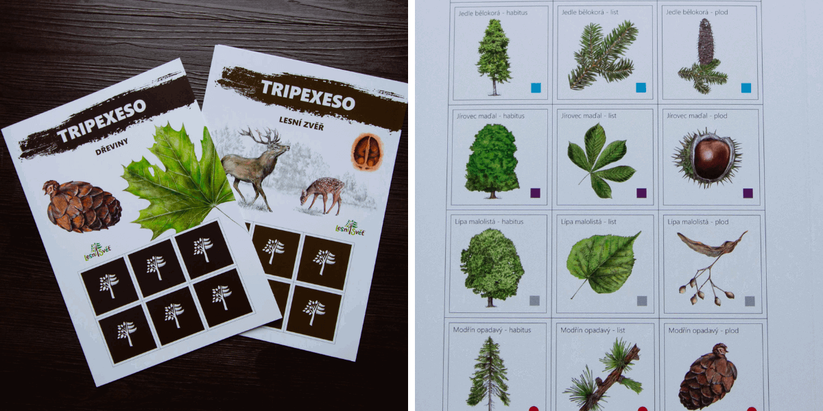 Zaujalo nás netradiční Tripexeso, kdy nehledáte 2 kartičky, ale hned 3. Mají zvířecí, kde hledáte vždy zvíře, jeho mládě a stopu a s dřevinami, kde zase hledáte strom, list a plod. Ideální pro školáky či trpělivé menší děti. Každou trojici spojuje barevný čtvereček, který napoví, když si nejste jisti.