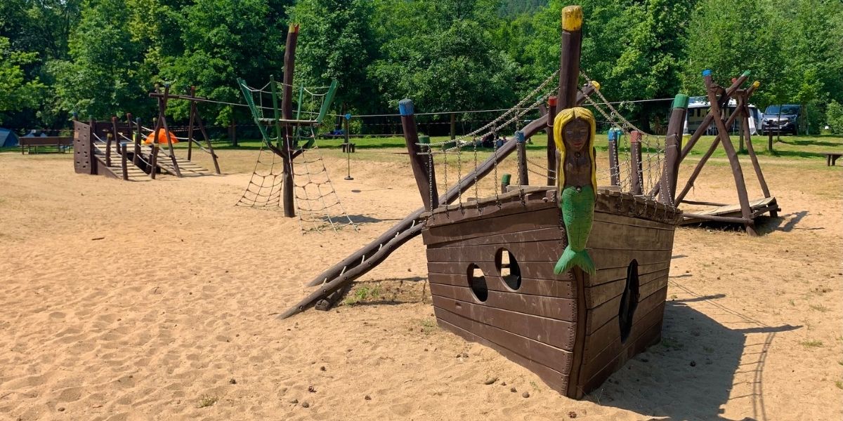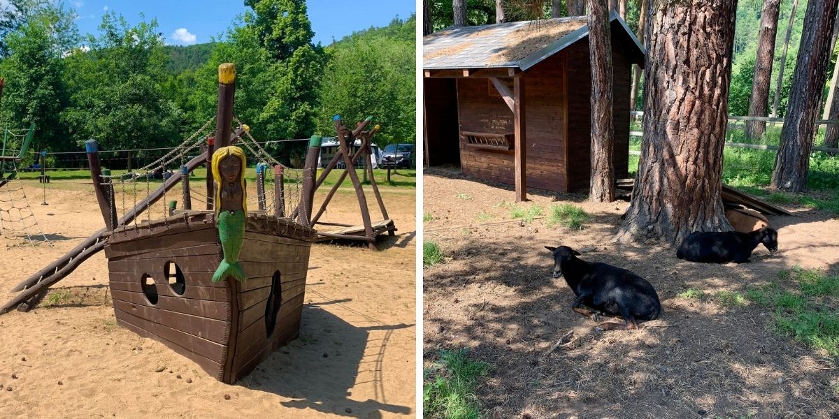 Krátkou procházkou jsme od muzea došli na Sázavský ostrov, kde byl příjemný chládek i za parné červnové soboty. Na ostrově se děti určitě zabaví. Je tu obří trampolína (ta byla bohužel od slunce rozpálená k nevydržení), ohrady s kozami a ovečkami i krásné dětské hřiště s pirátskou lodí. Můžete si tu půjčit lodičku a projet se po řece. Funguje tu restaurace a kemp.