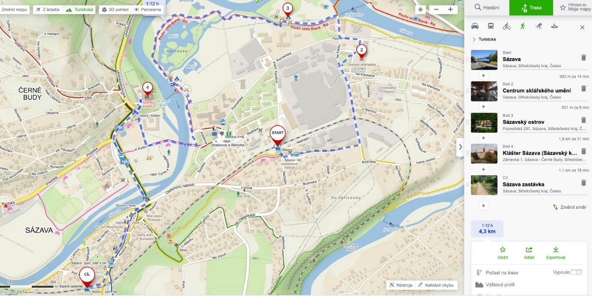 Pro cestu zpět jsme využili vlak ze stanice Sázava - zastávka. Celá trasa našeho výletu měřila 4,2 km a pohodlně ji jde zvládnout i s kočárky. Plánek je vytvořený v turistické mapě na www.mapy.cz.