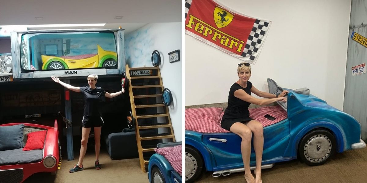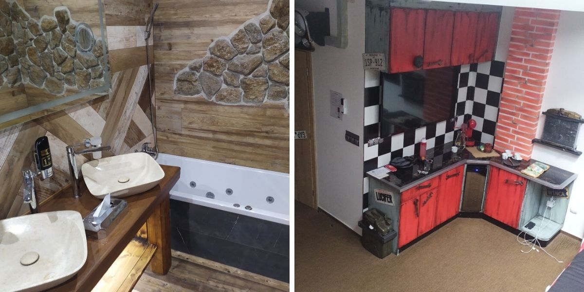 Po otevření vstupních dveří jsme jen žasli. Dokonalé, krásné, vše do posledních detailů propracované. Postele, skříně ze dřeva, krásná malba na zdi, volanty, klíče, matice jako ozdoba na stěnách. Opravdu jako v autosalonu. V pokoji byla luxusně vybavená koupelna se sprchou i vanou a základní kuchyňka s kávovarem.
