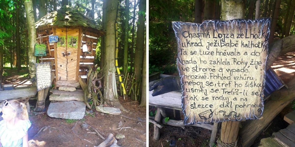 Ještě jsme si prošli známou stezku, která Vás přivede k Peklu, dozvíte se spoustu zajímavostí z úkolů a cesta vám tak líp uteče. Zastávka je u čarodejnice Bromildy, která Vám dá vypít hadí jed:-)) Škoda, že zrovna nejezdil Konibus, ten máme moc oblíbený. Jde o projížďku čertovským povozem s koňmi. Cestu děti plní úkoly a tatínci kydají hnůj.