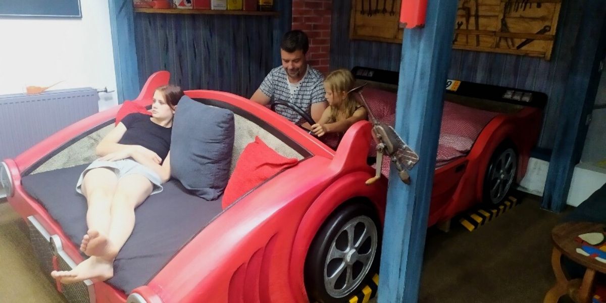 Z výhry pobytu jsme byli nadšeni, na cestu za čerty jsme se vydali z nedalekých Pardubic, na místo jsme dojeli za 45 minut. Peklo Čertovina se nachází v lesích Medkovy Kopce, cestou nás vedly cedule. V hotelu Kocourkov je každý pokoj úplně jiný, my si vybrali a domluvili už před příjezdem pokoj " Autosalon". Tento pokoj jsme zvolili, jelikož taťka nám v autech pracuje, tak aby se cítil jako doma.