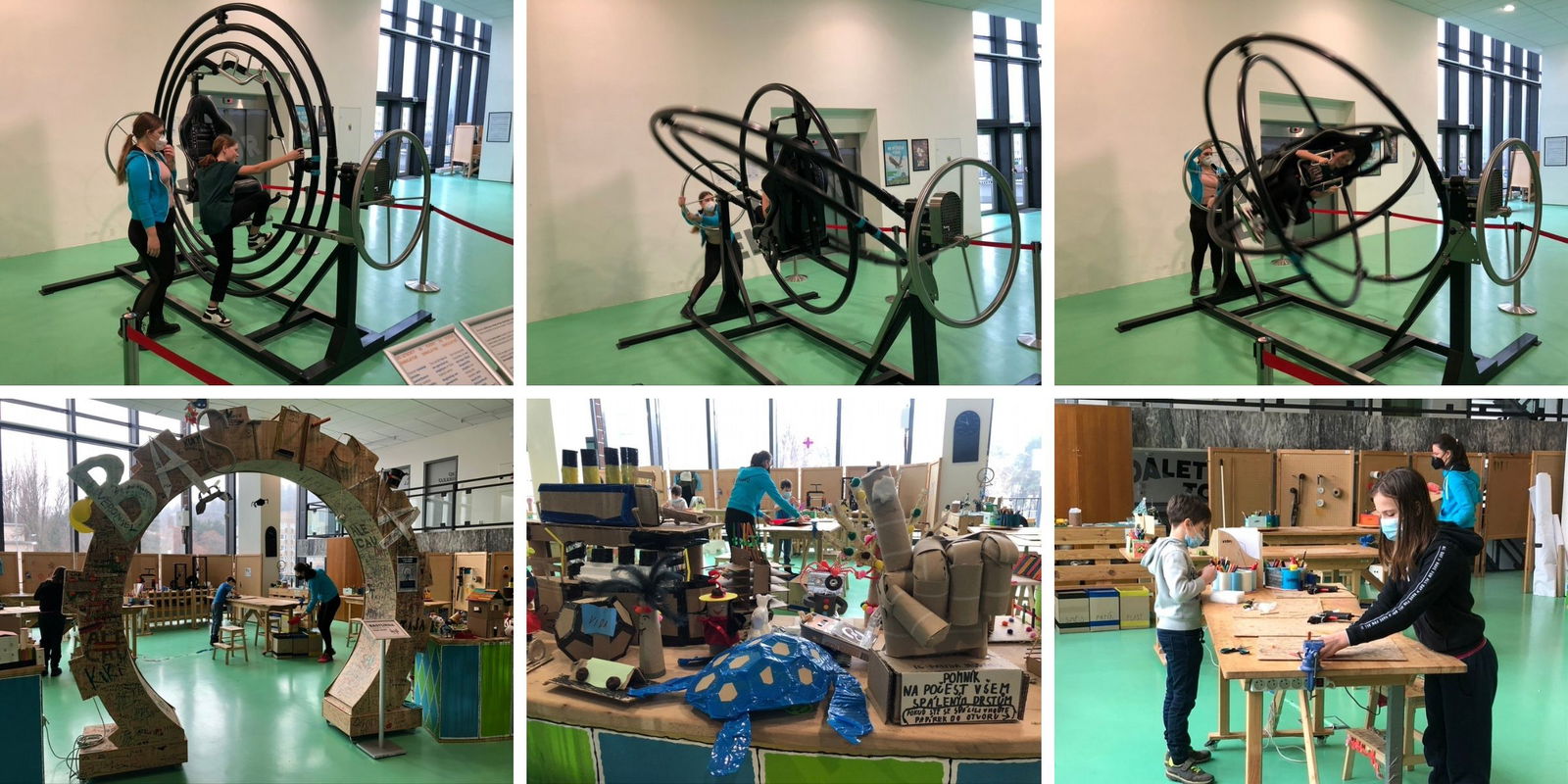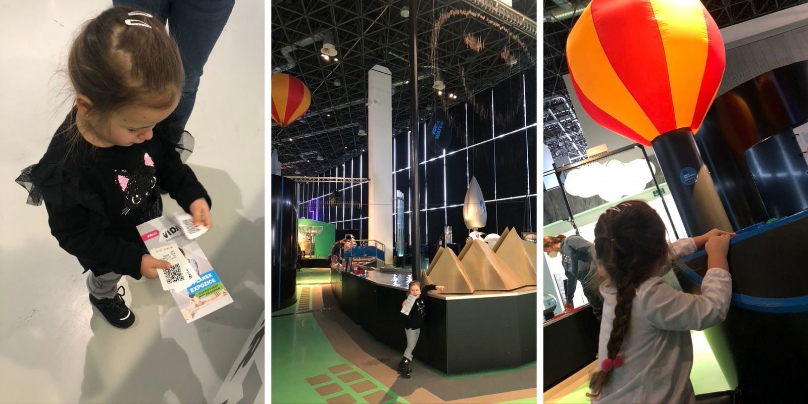 Velice příjemná paní v pokladně nás nasměrovala do sekce pro děti od 2 do 10 let, která se nachází hned za turnikety vlevo. Ještě předtím jsme si odložily zdarma kabáty v šatně a vyrazily na průzkum. Jako první jsme vypustily horkovzdušný balón, zatočily se na rotující lavičce, rozpoutaly tornádo a vytvořily tropickou cyklónu.