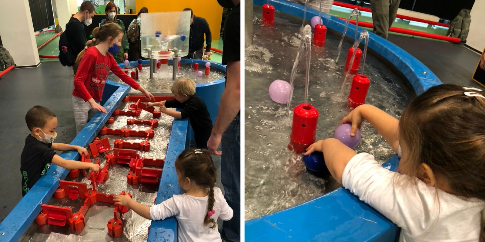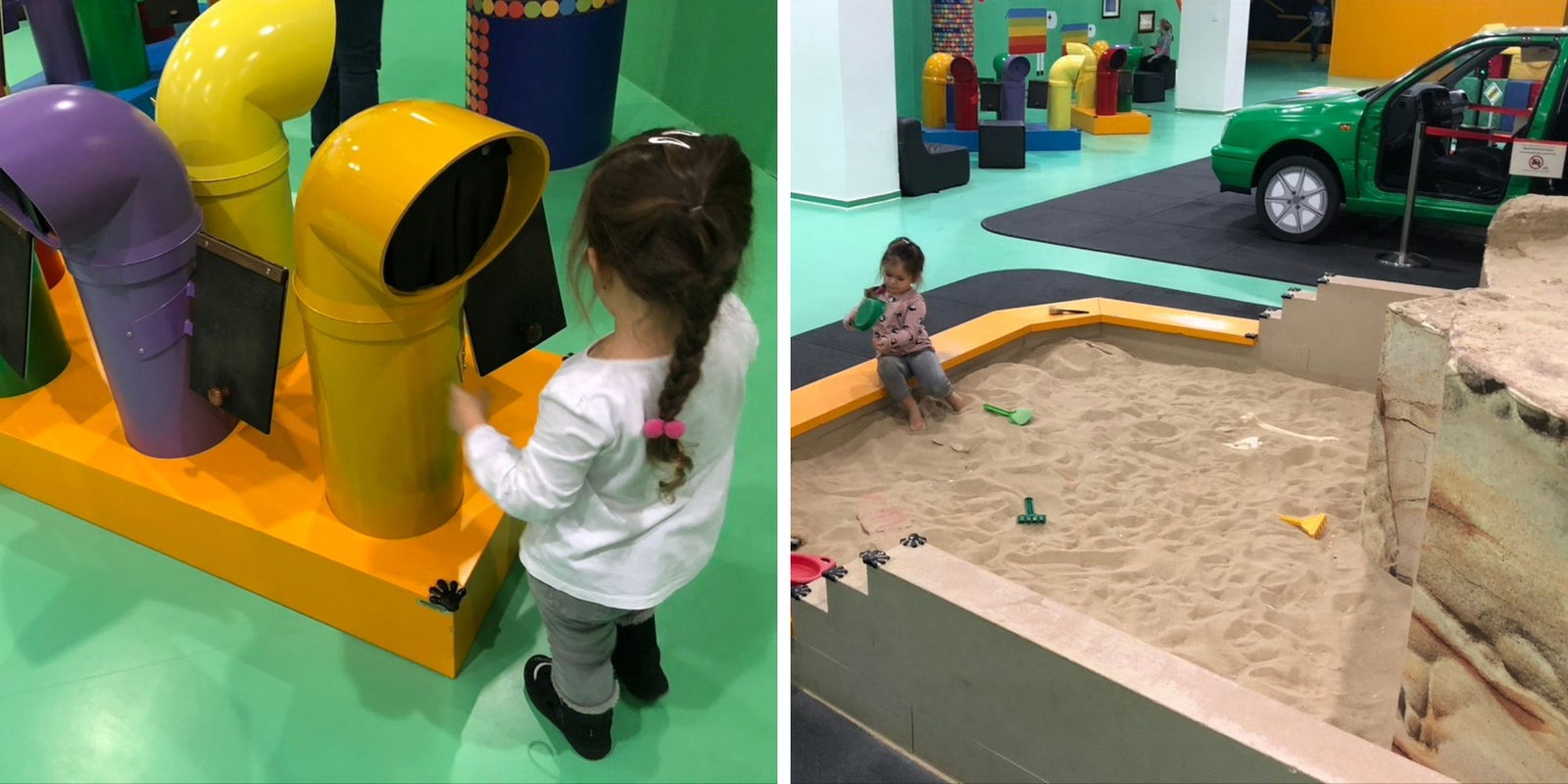 Naší další zastávkou byl prostor pro nejmenší objevitele. Tady jsme strávily nejdelší část naší návštěvy. Jednak na dopravním hřišti se semafory a značkami a dětském staveništi, ale také na prolézačce se skluzavkou. Starší děti určitě ocení, že jde vylézt skrz prolézačku až do prvního patra VIDA! centra. Odtud mimochodem vede dlouhá skluzavka dolů. Na tu jsem ale malou dcerku raději ještě nevzala. Největším lákadlem však byl dětský vodní svět. Tam jsme promočily tričko, převlíkly se a šlo se dál.