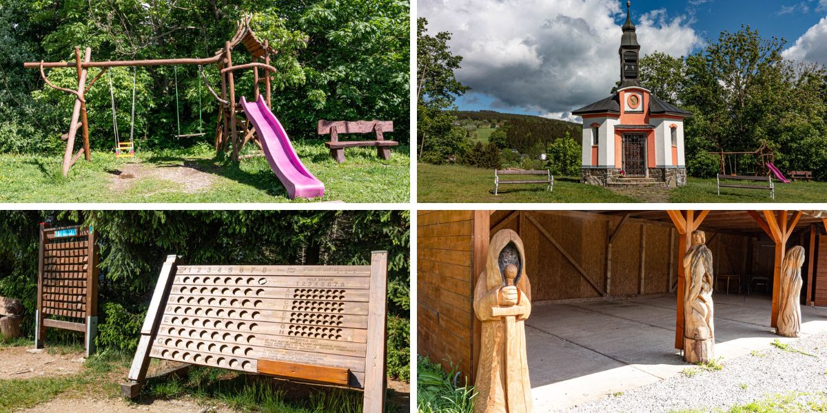 Trasa vede kolem kapličky sv. Huberta a u ní najdete dětské hřiště i lavičky = ideální pauza na svačinu a řádění.