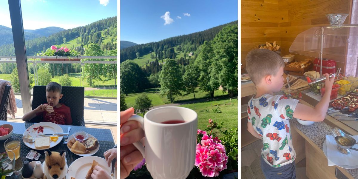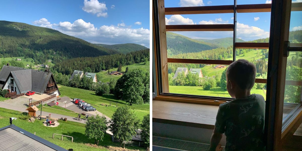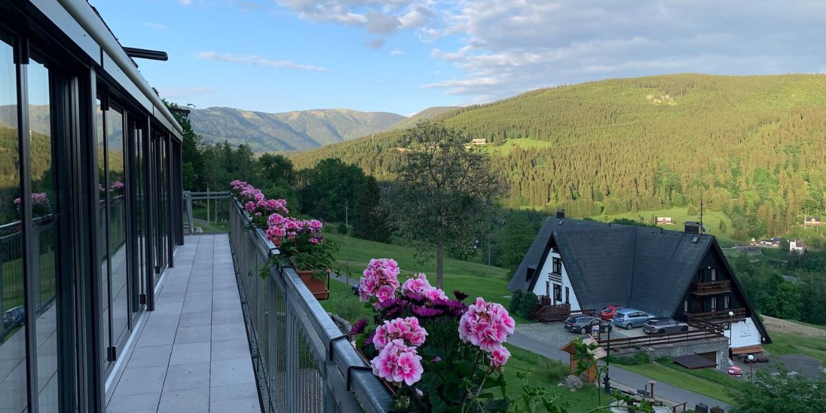 Po tomto výhledu se nám prostě bude stýskat. Určitě se zajedeme podívat, jak vypadá i se sněhem. Nad hotelem je vlek Krausovy Boudy, kousek je to k lanovce Labská a autem se za chvilku dostanete do skiareálů Medvědín nebo Svatý Petr.