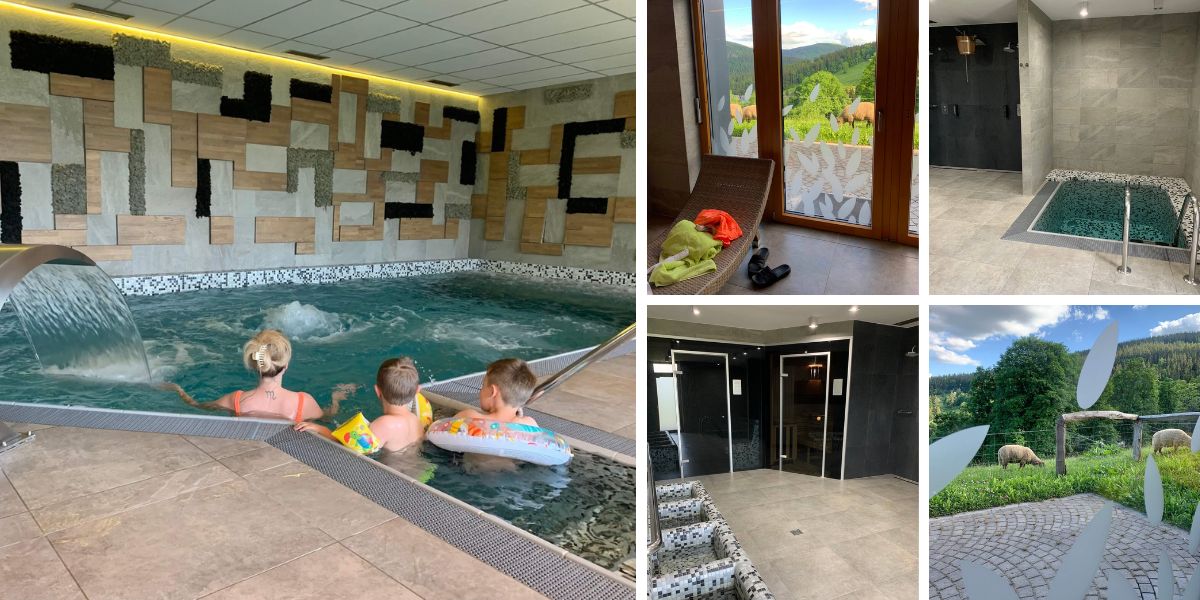 Oba kluci se celou cestu těšili do bazénu. Takže i když bylo venku nádherně, hned po ubytování jsme se vydali do hotelového bazénu. Mají tu také finskou i parní saunu, ochlazovací bazének a Kneippův chodník. Přímo z bazénu a lehátek je vidět na hory a pasoucí se ovečky.