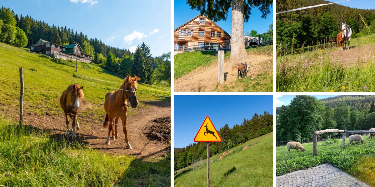 A všude je plno zvířat. Hotel obklopuje výběh pro ovce, kozy a prase. Brzy prý přibudou i husy. Kousek nad hotelem se pase stádo koní a pod hotelem zase najdete ohradu s daňky. Narazit tu můžete i na srnky, jelena či další obyvatele blízkého lesa.