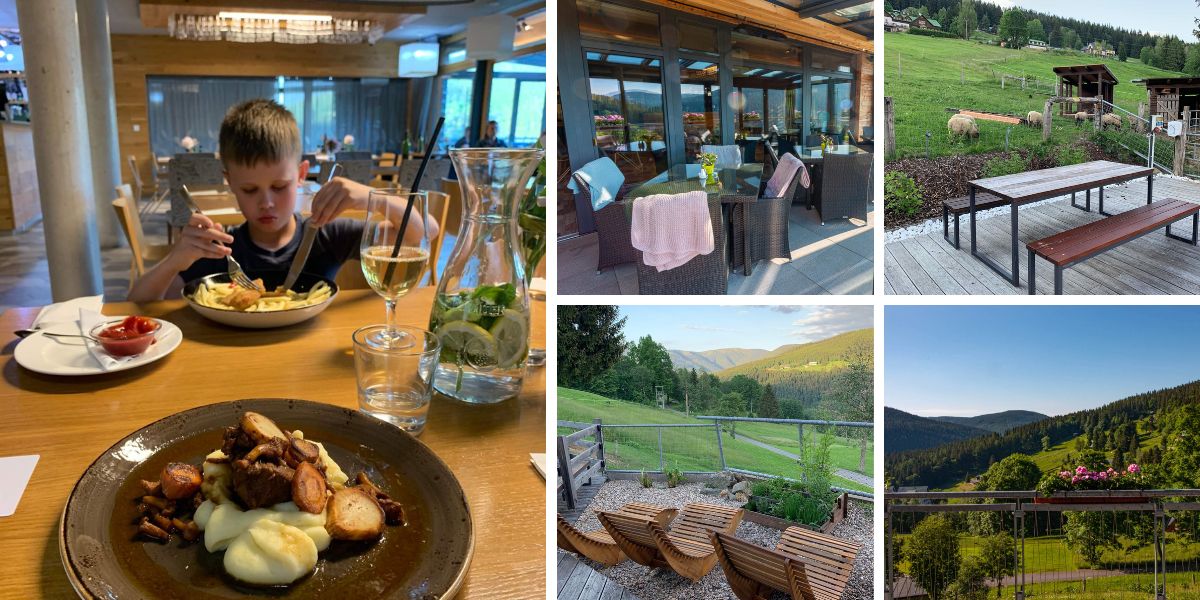 Hotelovou restauraci můžeme jen pochválit. Krásné prostředí, výborné jídlo, dětská nabídka v menu... a zase už několikrát zmiňovaný nádherný výhled do okolí.