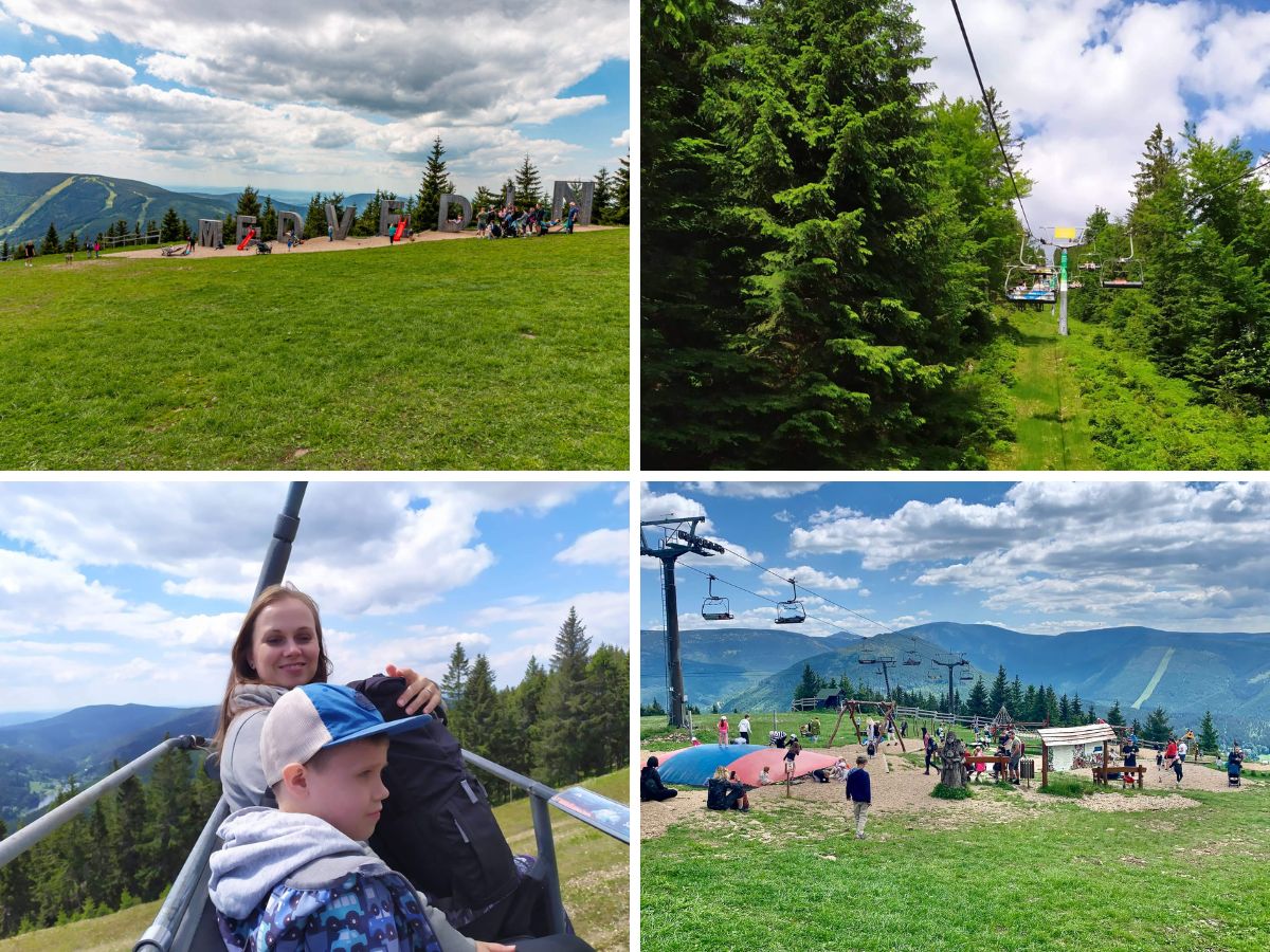 Po dlouhé snídani a chvilce na hřišti jsme se vydali lanovkou na Medvědín. U horní stanice lanovky počítejte s dlóooooouhou zastávkou, mají tu totiž parádní dětské hřiště. Ale čekání na děti vám jistě vadit nebude - užijte si výhled a je tu i restaurace.