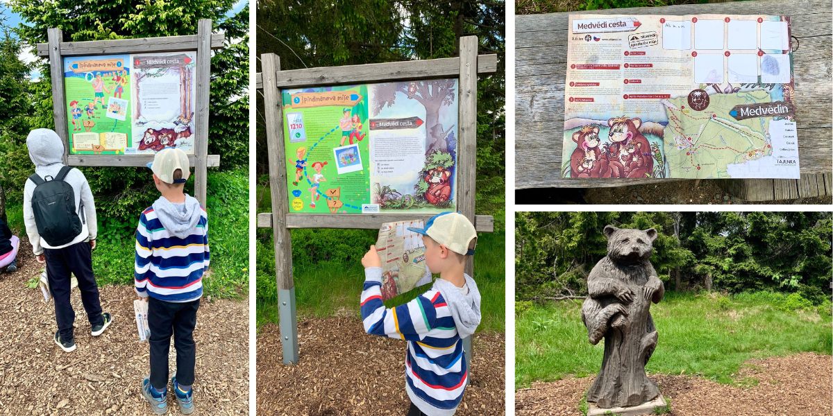 Z Medvědína zpět na parkoviště vedou dvě stezky pro děti s úkoly. Při nákupu jízdenky si vyzvedněte mapku vydejte se za dobrodružstvím. My šli červenou Medvědí cestu. Měří necelých 9 kilometrů, ale až na krátký úvodní úsek jdete pořád z kopce, takže ji bez problémů ujdou i malé děti. Lze ji absolvovat i s kočárkem, ale určitě volte typ vhodný do terénu.
