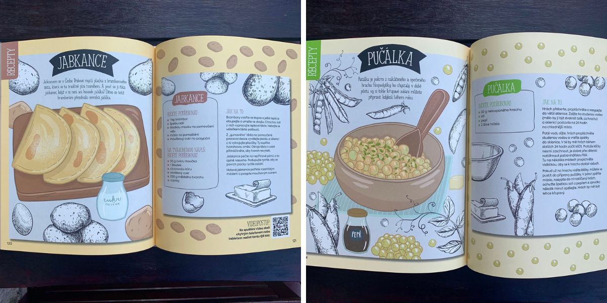 Z každého kraje autorka knížky vybrala 2 typická jídla, která si můžete s dětmi uvařit podle receptu. Polovina z nich obsahuje i QR kód s videonávodem, takže to bude úplná hračka.