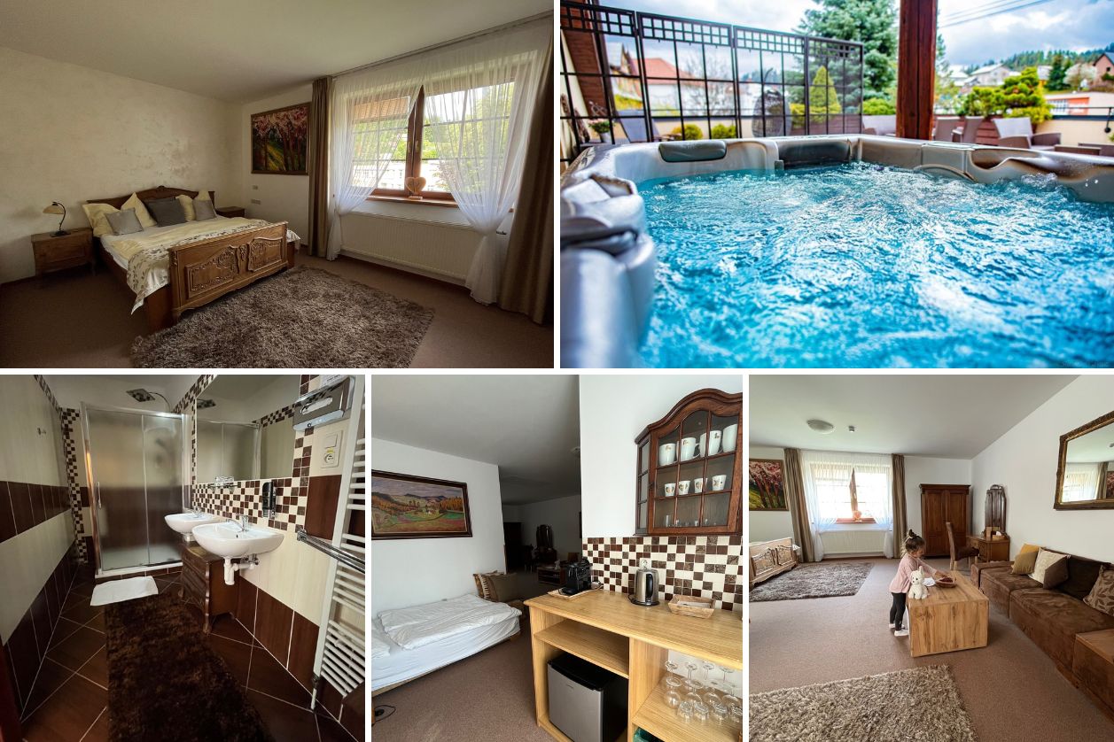 Penzion i restauraci vede už 13 let s láskou velice milá rodina. Budovu tehdy koupili v dezolátním stavu a vlastní pílí ji dokázali zrekonstruovat na krásný a útulný penzion s jedenácti pokoji. My nocovali v rodinném apartmá, což je pro čtyřčlennou rodinu opravdu prostorný pokoj. K dispozici je zde i pokoj s terasou a venkovní vířivkou, kterou můžou mezi 10. a 18. hodinou využívat hosté, od 18 hodin pak už jen hosté z pokoje číslo 5.