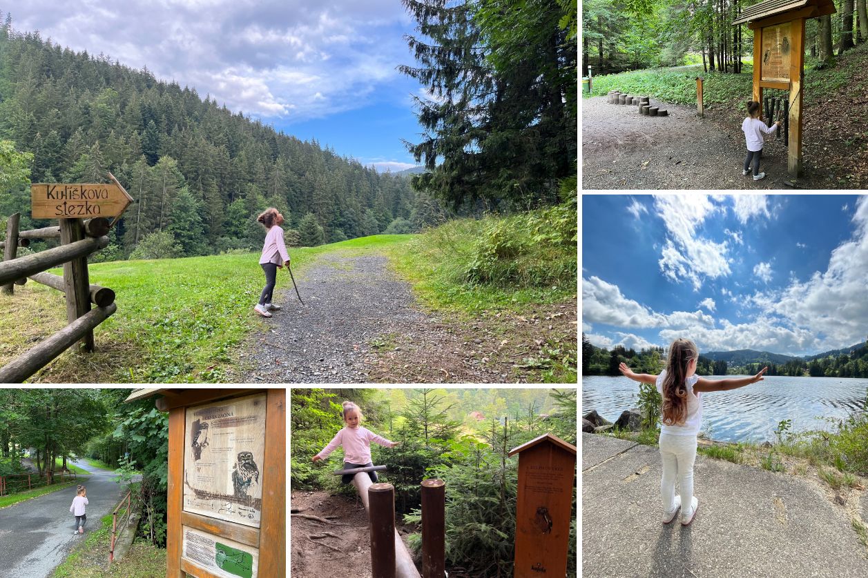Penzion Staré Časy je skvělým výchozím bodem pro toulky Beskydami. Vede kolem něj krásná cyklostezka, po které se dostanete k přehradě Horní Bečva nebo, vydáte-li se na opačnou stranu, do Rožnova pod Radhoštěm se skanzenem, ti zdatnější až do Valašského Meziříčí. Kousek je to také na Pustevny se Stezkou Valaška, na Radhošť nebo rozhlednu na vrchu Miloňová. Za 15 minut jsme autem dojeli do obce Velké Karlovice a prošli si Kulíškovu naučnou stezku. Vede lesem, má 10 zábavných zastávek a protože není dlouhá, zvládnou jí s přehledem i malí chodci. Chcete-li jít s batoletem, bude lepší nosítko nebo opravdu terénní kočárek.