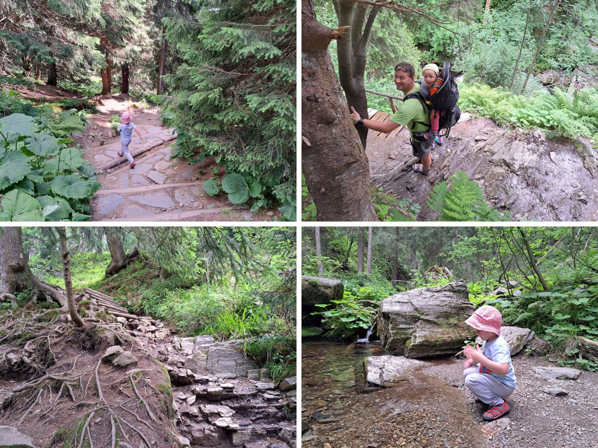 My tentokrát nechali kočárek doma, při cestě zpět jsme totiž odbočili u chaty Barborka a vydali se Naučnou stezkou Bílá Opava zpět dolů do Karlovy Studánky. Trasa je dlouhá šest kilometrů, prochází těsně kolem vodopádů a patří jistě k nejkrásnějším, ale také nejnavštěvovanějším trasám v Jeseníkách. Trasa vede po můstcích, žebřících, lávkách a je poměrně náročná, s malými dětmi jedině v nosítku a chce to určitou dávku zdatnosti. Šestiletá dcera už neměla problém trasu zvládnout sama.