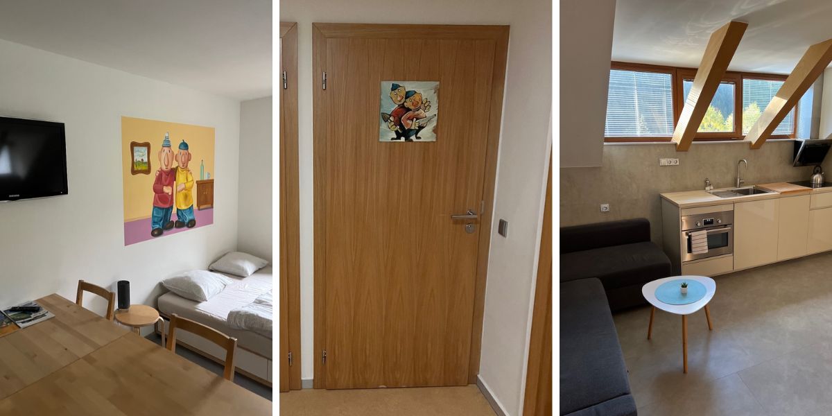 Každý pokoj tu mají pojmenovaný po některé z dětských pohádek. Praktické, tohle si nejmenší hosté pamatují mnohem lépe než číslo. My jsme se ubytovali v pokoji Pat a Mat. Jde o prostorné studio s kuchyňským koutem, jídelním stolem, manželskou postelí, rozkládacím gaučem a vlastní koupelnou.