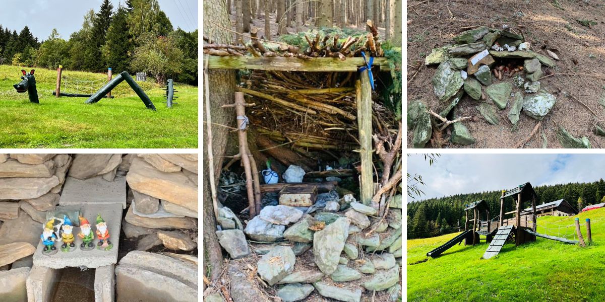 A pak už se nás ujala milá paní majitelka Zuzana, která nám ukázala dvě venkovní hry s hledáním pokladu. První stezka měří 2,5 km a v pohodě jí zvládnete s dětmi do hodinky. Druhá je dlouhá přibližně 3,5 km. Start i cíl obou okruhů je v Permoníku.