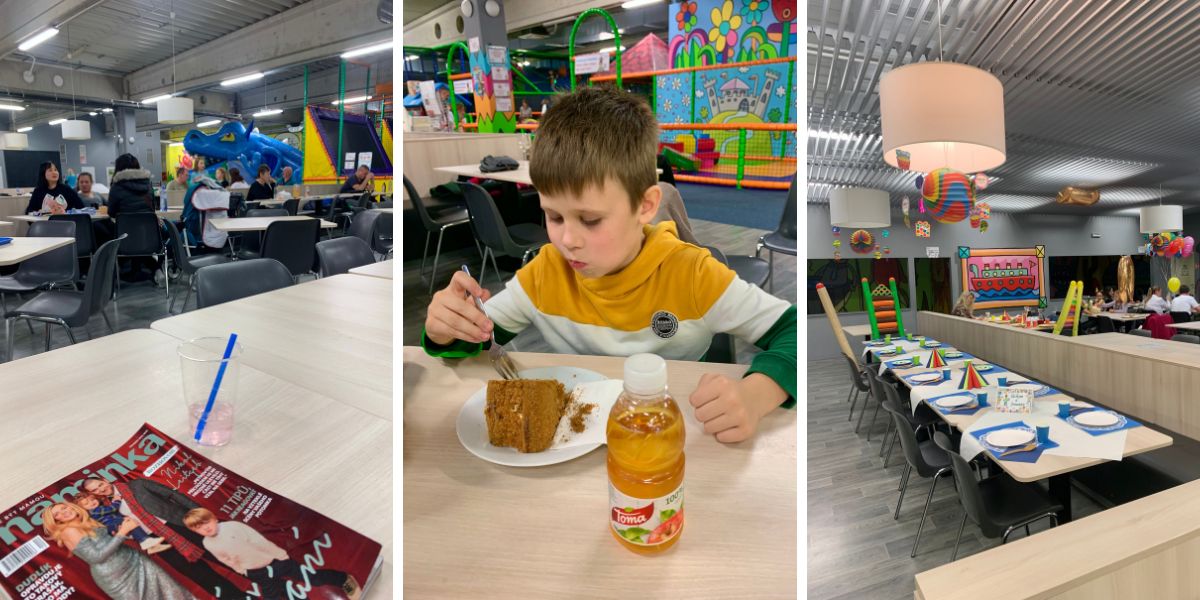 Po tom všem lezení, skákání a ježdění vyhládne. Součástí centra je proto restaurace. Dá se tu klidně i naobědvat, ale my tu byli až odpoledne, takže stačila svačinka. V centru se také pořádají narozeninové oslavy, kdy můžete mít nazdobený stůl, kam oslavenec a jeho hosté v pauzách mezi řáděním dorazí.
