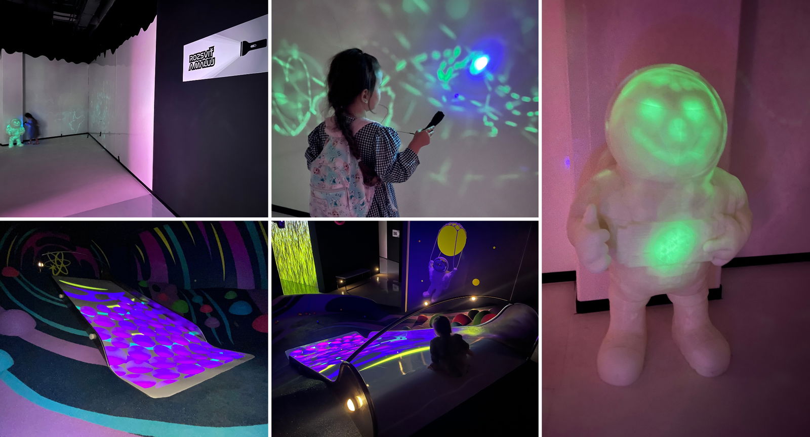 Při vstupu dostanou dospělí i děti deštník (pro prcky mají malinké, které unesou) a vydávají se na pouť vesmírem barev. Stačí držet deštník nad hlavou a můžete se kochat neskutečnými kombinacemi barev a tvarů, které se na něj promítají. Cestou se zastavte v zrcadlové místnosti a nechte proudit tok myšlenek i slov vašich dětí. Jejich čistá duše a nekončící fantazie tady bude ve svém živlu.