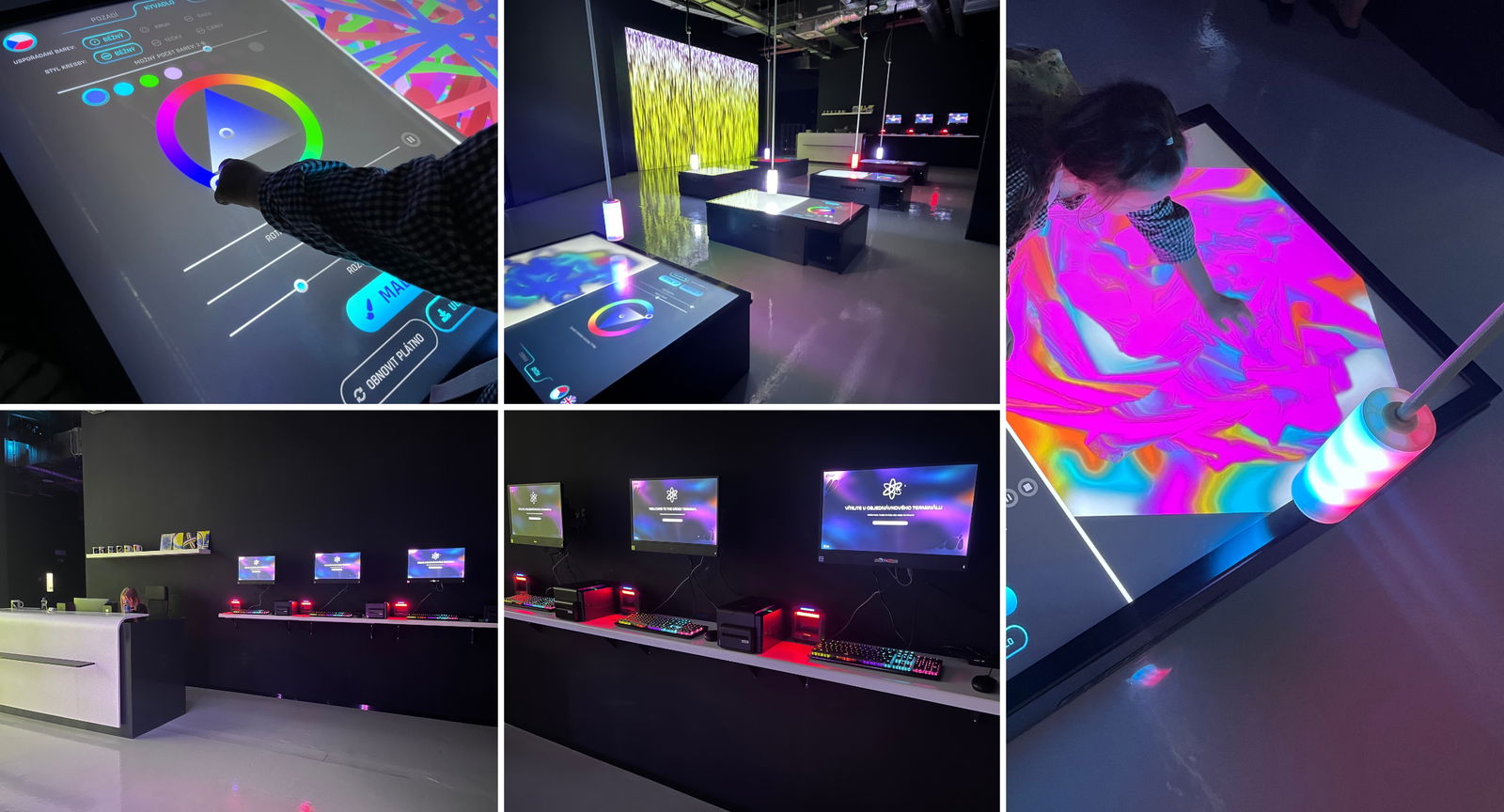 V další části Galaxie barev vás čeká místnost plná malování. Tentokrát ale bez toho, abyste se zapatlali barvami - maluje se pomocí rukou nebo elektronických kyvadel na obrovský displej. Na displeji si navolíte barvy, intenzitu i druh čar a rozhoupete elektronické kyvadlo. A takto můžete "malovat" velice, velice dlouho. Nebudete-li s výtvorem spokojeni, stačí ho jedním ťuknutím smazat. Bude-li se vám výsledná malba líbit, vytisknete si QR kód. Pomocí něj si zobrazíte svůj výtvor v počítačích vedle a současně si ho zde můžete nechat zaslat v tiskové kvalitě na e-mail, případně si ho rovnou objednat vytištěný na tričku či hrníčku.