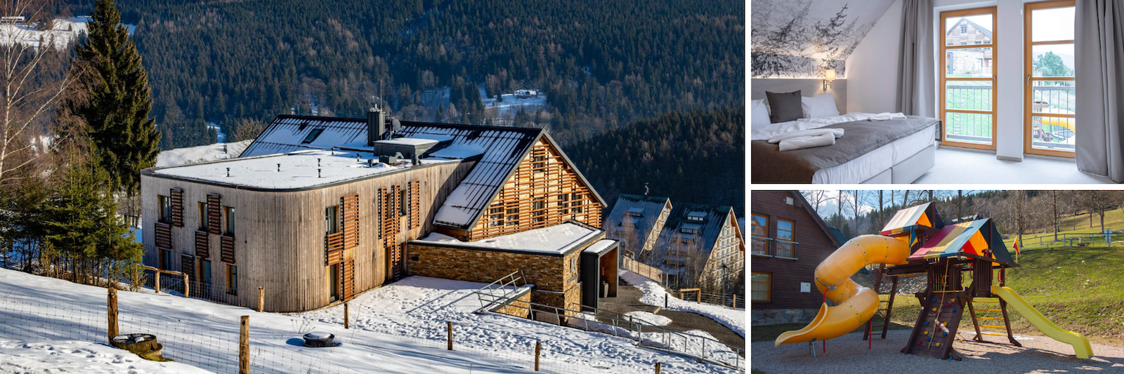 Jen kousek od sjezdovky Labská a zastávky bezplatného skibusu do areálů Svatý Petr, Medvědín či Hromovka objevíte tento moderní hotel s malým wellness centrem, bazénem, dětskou hernou i hřištěm.