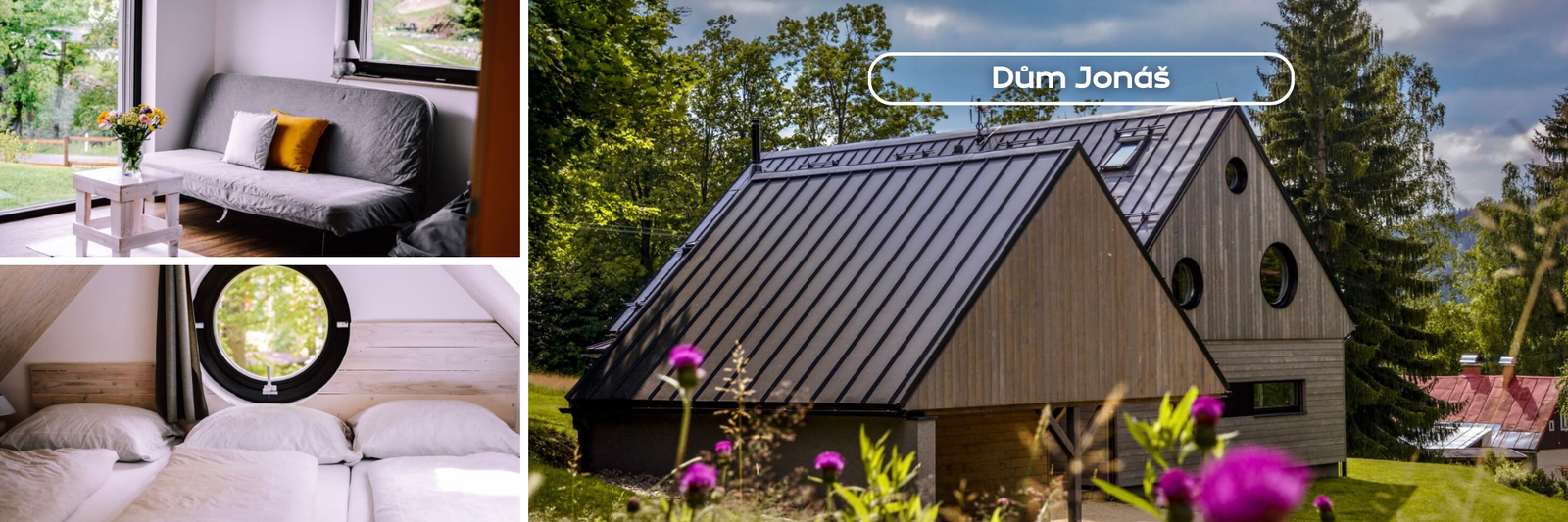 V krásné přírodě Jizerských hor najdete první architektonický skvost. Dům Jonáš vám učaruje už z dálky. Velká okna, která dovnitř propouští sluneční paprsky a v patře kulatá okna, díky kterým si občas budete připadat jako na palubě zaoceánské lodi.